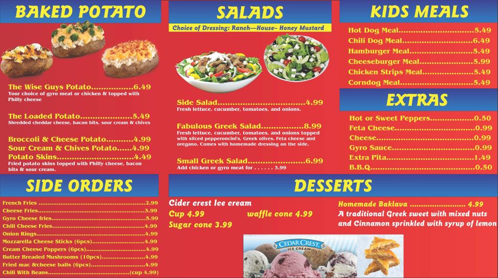 At wiseguys, the commitment to quality shines through every dish. The Fabulous Greek Salad is a true standout, featuring a vibrant mix of fresh lettuce, crisp cucumbers, juicy tomatoes, and tangy Greek olives, all elevated with a sprinkle of feta cheese and a homemade dressing. For those seeking something heartier, the Chicago Dog is a must-try. This all-beef delight is packed with flavor and garnished with classic toppings that bring a taste of Chicago right to your plate. With customer favorites like the Maxwell Street Polish and the flavorful Gyro Meal, there’s no shortage of delicious options to explore.